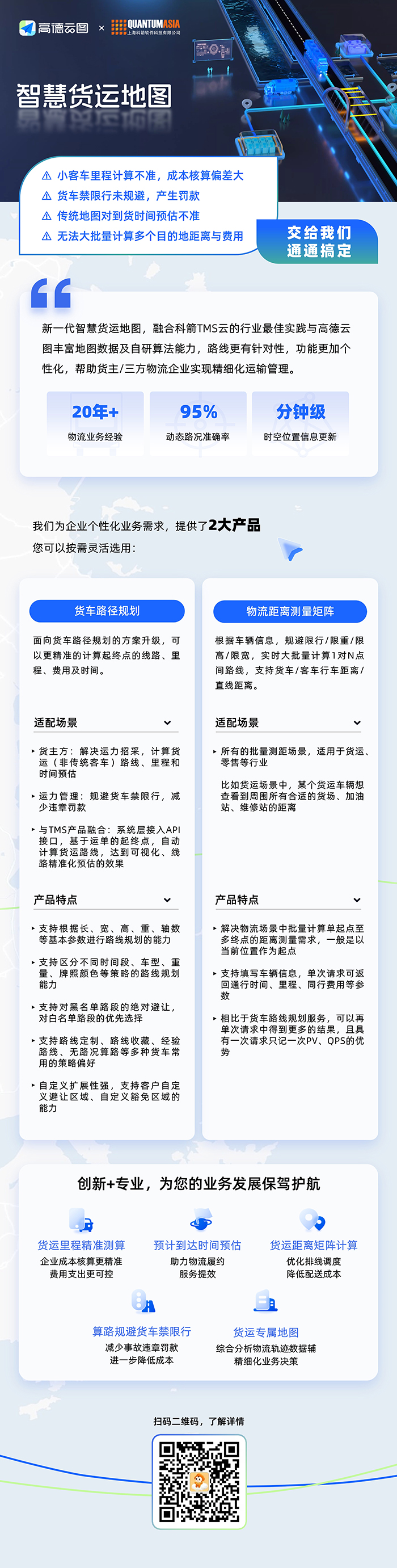 我們期望未來可以與高德云圖一道,從云計算到人工智能,不斷優化智慧貨運地圖,幫助貨主有效應對各類運輸挑戰,賦能物流行業產業持續升級。