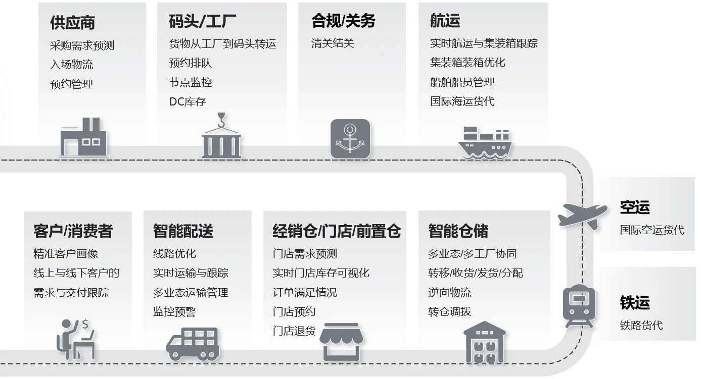 從原材料到生產線,從倉儲到海、陸、空、鐵運輸配送,從經銷商、門店等營銷渠道到產品交付給最終客戶及消費者;打通上下游數據,提供從訂單履行、倉配協同、智能優化及到數據洞察的一體化解決方案,實現端到端協同與可視。讓供應鏈各個環節的信息透明化,以確保供應鏈的及時響應與高效運轉。