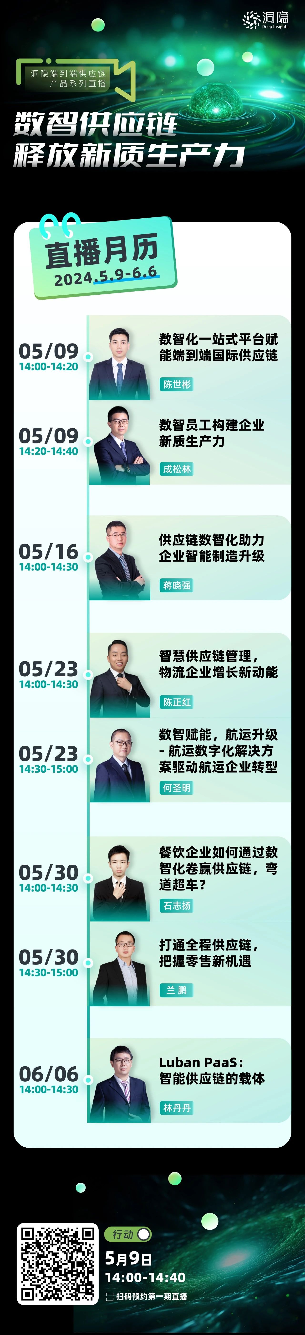 在此變局下,洞隱基于面向供應鏈未來的產品設計和20年供應鏈數字化實戰累積,特別策劃了“數智供應鏈,釋放新質生產力”系列直播,期待可以為貨主、物流企業實現生產力升級提供路徑參考和落地支持。