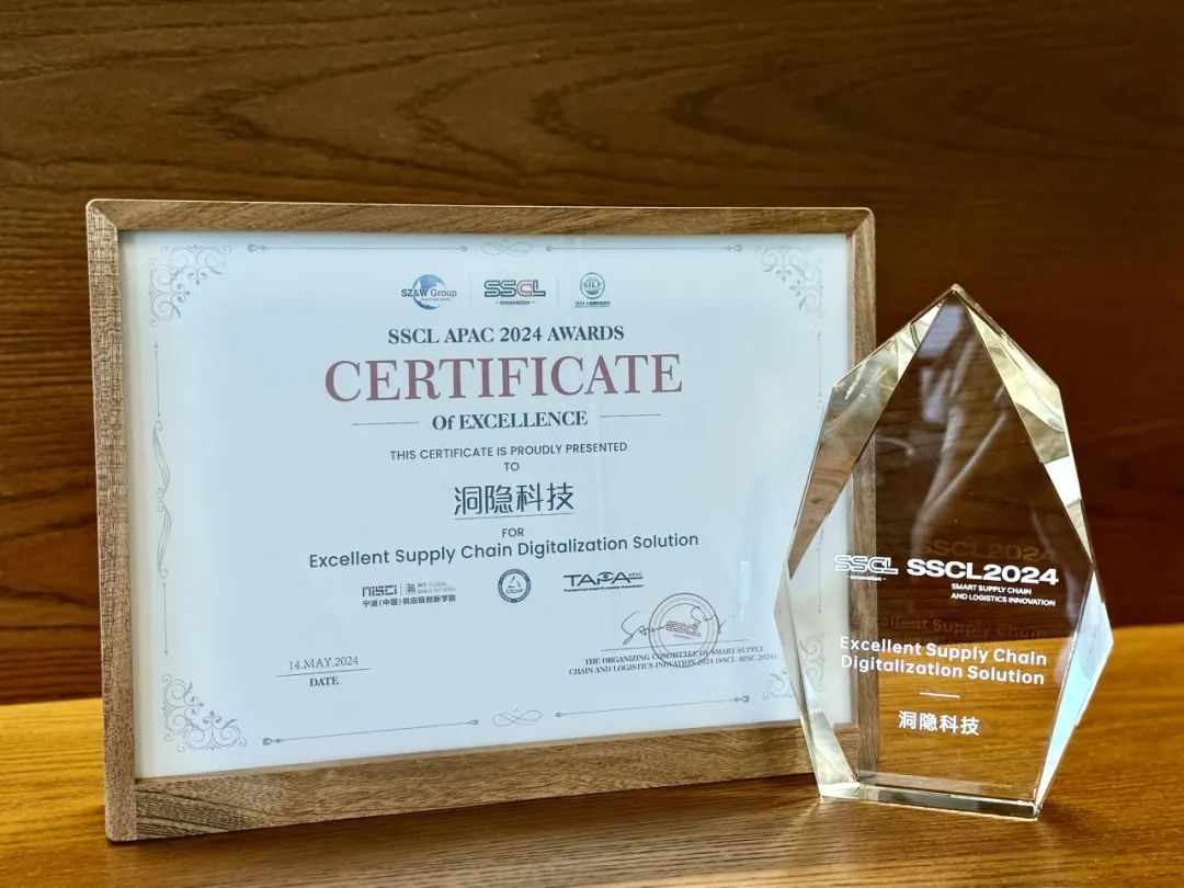在同期舉辦的2024年度“SSCL金鏈獎”頒獎典禮上,洞隱科技憑借出色的產品服務和顯著的企業應用價值,獲頒“最佳供應鏈數字化解決方案獎”。“SSCL金鏈獎”由來自行業協會、產業聯盟、媒體及咨詢公司等機構的各方專業人士組成的評審委員會討論評選出各獎項入圍名單,經多輪評議和投票產生年度獲獎名單,這也是洞隱科技連續第二年入選該名單。