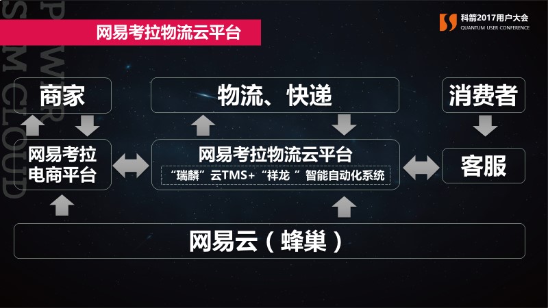 基于以上思考我們與科箭一起聯(lián)合打造了“瑞麟”TMS云平臺,再加上“祥龍 ”智能自動(dòng)化系統(tǒng),構(gòu)成了網(wǎng)易考拉的物流云平臺。基于網(wǎng)易云把網(wǎng)易考拉平臺上的商家、用戶、消費(fèi)者、客服、快遞無縫連接,整個(gè)訂單履約環(huán)節(jié)做得更清晰更明確。