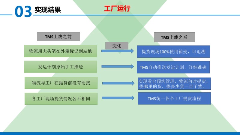 使用TMS云平臺之后,在提貨現(xiàn)場實現(xiàn)100%使用箱麥,客戶信息得到體現(xiàn);同時通過自動計劃傳遞所有明細,取代了原先的手工操作;月臺預(yù)約管理功能使所有的提貨信息,包括