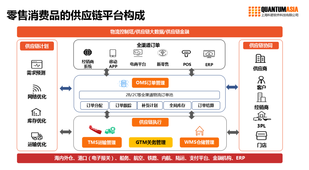 蘭鵬先生介紹了科箭在零售消費品的供應鏈平臺構成。科箭圍繞訂單、倉儲運輸、關務管理等供應鏈執(zhí)行的系統(tǒng),服務于全渠道訂單,全渠道平臺還關聯(lián)到供應鏈的協(xié)同,涉及供應商、客戶、經(jīng)銷商、第三方物流、承運商、門店等等。在此基礎上,更在供應鏈計劃進行需求預測、網(wǎng)絡優(yōu)化、庫存優(yōu)化、運輸優(yōu)化,這也是在搭建供應鏈平臺中很關鍵的點。科箭還提供了物流控制塔、大數(shù)據(jù)分析、供應鏈金融等服務,為企業(yè)構建敏捷、高效、智能、數(shù)字化的供應鏈。