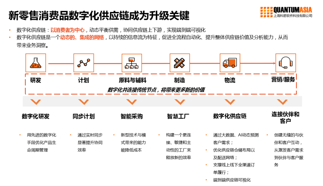 數(shù)字化供應鏈可以理解為以消費者為中心,動態(tài)平衡供需,協(xié)同供應鏈上下游,實現(xiàn)端到端可視化。基于此,新零售消費品數(shù)字化供應鏈升級關鍵包括以下幾個方面: