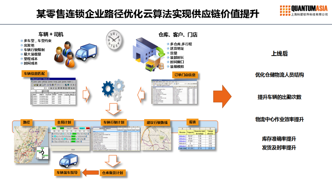 這是科箭為零售連鎖客戶進行門店運輸的優化。在路徑優化方面,科箭有一套強大的啟發式、運籌學的算法。通過車輛、司機、倉庫、客戶門店的不同約束,循環取貨、城市配送、多點送貨,實現物流運輸的路徑優化。倉庫人員、運輸人員的結構,車輛的出勤次數、運費節約、物流作業效率、發貨及時性和準確率,都會有相應的提升。