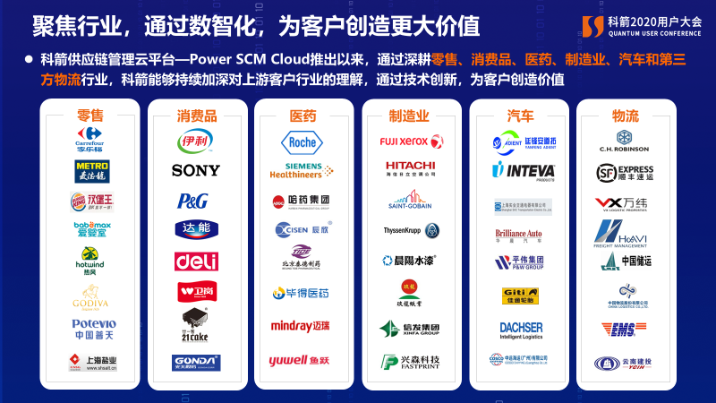 憑借不斷創(chuàng)新的產品、專業(yè)的團隊、優(yōu)質的服務,科箭贏得了眾多客戶的認可。科箭供應鏈管理云平臺—Power SCM Cloud推出以來,已經在家樂福、麥德龍、漢堡王、羅氏醫(yī)藥、哈藥集團、伊利集團、延鋒安道拓、富士施樂、普天太力、玖龍紙業(yè)及C.H. Robinson、德莎物流、中儲物流等行業(yè)領導企業(yè)成功應用。通過深耕零售、消費品、醫(yī)藥、制造業(yè)、汽車和第三方物流行業(yè),科箭能夠持續(xù)加深對上游客戶行業(yè)的理解,不斷鞏固自己的競爭優(yōu)勢。