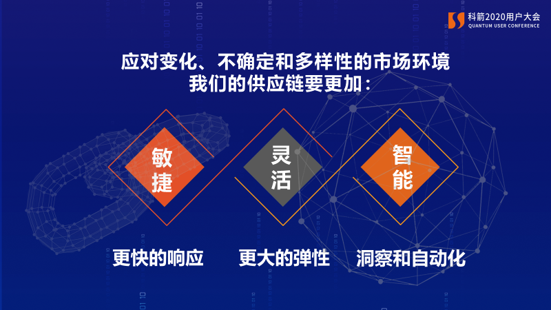 劉斌在主題演講中指出,供應鏈需要重構,因為我們面臨著一個變化的、不確定的、多樣化的世界。要應對這些挑戰(zhàn),我們需要重構供應鏈。在過去幾年的科箭用戶大會上,劉斌就曾提到過供應鏈網絡化及數字化技術的賦能等關鍵詞,我們的供應鏈要更加: