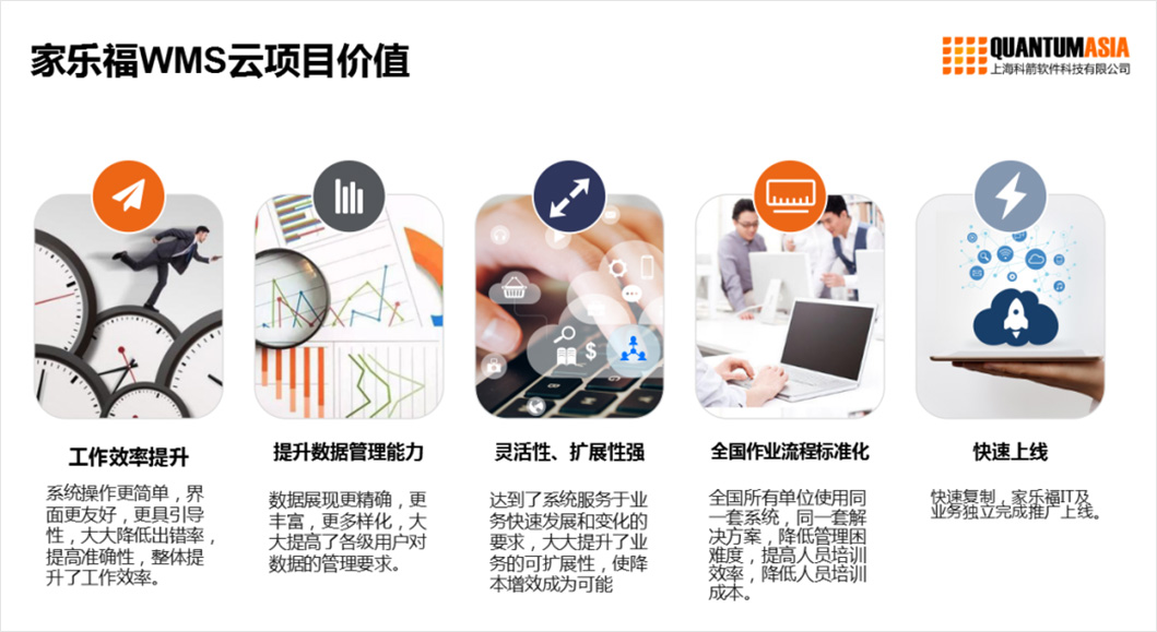 科箭為家樂福打造的WMS云項目幫助家樂福實現了工作效率的提升,數據管理能力的提升,具有靈活性、擴展性強等特點,能夠快速上線,實現全國作業流程的標準化,不僅獲得了家樂福大陸地區的肯定,家樂福臺灣也對科箭的產品產生了極大的興趣和需求,決定使用科箭全系列產品替代原有的老舊系統,除了解決與家樂福大陸地區WMS系統存在的同樣問題,更好地應對臺灣地區門店數量和供應商更多等棘手問題。
