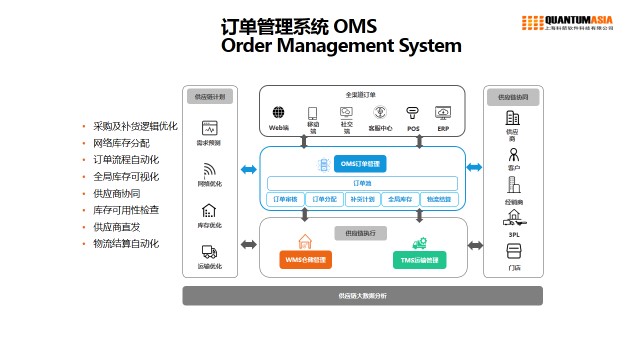 涉及到外部訂單管理,由移動端,社交端,POS機等設備的數(shù)據(jù)傳輸?shù)较到y(tǒng),通過訂單的組合,實現(xiàn)訂單池的分配、調(diào)度、整合,再與倉配系統(tǒng)進行協(xié)同,服務于供應鏈的前端與后端。