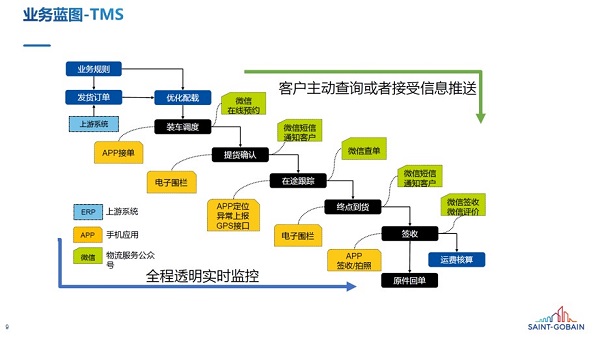圣戈班與科箭合作,打造了一個以WMS和TMS系統為核心的物流管理平臺。這個平臺涉及整個在供應鏈管理當中的各個參與者,包括供應商、生產部門、倉庫、承運商以及司機還有客戶,向上通過OMS系統通過鏈接定單系統,ERP網上商城把定單和物流對接。依托這樣的物流管理平臺,圣戈班形成了一系列標準的物流作業流程。