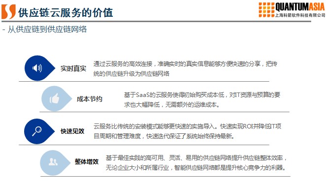 三、供應鏈云服務的實現可以通過:合作伙伴協作互聯、智能化、即插即用的擴展和快速實施。