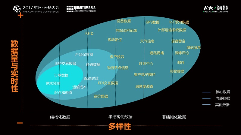 IDC與EMC有個(gè)報(bào)告,到2020年,數(shù)據(jù)宇宙的量級(jí)在40000EB,相當(dāng)于人均數(shù)據(jù)量是5000GB。具體到供應(yīng)鏈中,我們可以看到,在當(dāng)前的數(shù)字時(shí)代,可用的供應(yīng)鏈的數(shù)據(jù)的確變得更加龐雜,企業(yè)能夠獲得的數(shù)據(jù)不限于以ERP為核心的結(jié)構(gòu)化數(shù)據(jù),還增加了許多半結(jié)構(gòu)化數(shù)據(jù)和非結(jié)構(gòu)化數(shù)據(jù),這些數(shù)據(jù)來源于EDI的連接、供應(yīng)商或三方物流的反饋、公共的交通服務(wù)信息等,比如天氣、車輛位置信息、實(shí)時(shí)的路況,還有大量的微信和QQ等社交往來記錄,也有了很多IoT的感知數(shù)據(jù)。這些都對(duì)新物流下的供應(yīng)鏈管理帶來挑戰(zhàn)。