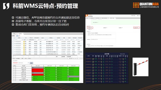 科箭的預(yù)約管理功能和WMS緊密結(jié)合在一起。我們通過(guò)微信、APP和網(wǎng)頁(yè)端進(jìn)行預(yù)約月臺(tái),并通知倉(cāng)庫(kù)提送貨信息。通過(guò)連接一個(gè)電子看板,讓倉(cāng)庫(kù)當(dāng)天的提送貨信息一目了然。我們還有些客戶(hù)集成了倉(cāng)庫(kù)和物流園區(qū)停車(chē)場(chǎng)的門(mén)禁系統(tǒng),然后車(chē)輛的出入就可以和預(yù)約結(jié)合在一起,沒(méi)有預(yù)約進(jìn)不了倉(cāng),車(chē)在園區(qū)多長(zhǎng)時(shí)間你都可以控制。這既提升了廠區(qū)管理及倉(cāng)庫(kù)效率,也為配送司機(jī)帶來(lái)方便。
