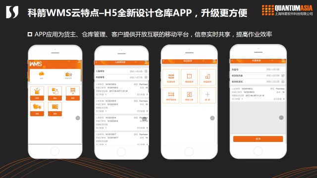 原來(lái)的WMS客戶(hù)基本都是使用PDA設(shè)備,然后在這個(gè)上面開(kāi)發(fā)一個(gè)CS的程序,就能用APP進(jìn)行掃描收貨、上架等工作了。我們現(xiàn)在是開(kāi)發(fā)了WMS APP來(lái)做盤(pán)點(diǎn)、上架和揀貨的。另外我們還有管理人員APP,你的客戶(hù)和倉(cāng)庫(kù)的管理人員以及銷(xiāo)售、客服部門(mén)的人員等。我們做的是基于H5的APP,可以跨平臺(tái),支持蘋(píng)果手機(jī)和安卓手機(jī)。現(xiàn)在的人能用手機(jī)處理的事情就不用電腦。我們也是這樣的理念,我們會(huì)把所有的功能在APP上實(shí)現(xiàn),管理人員用APP可以隨時(shí)關(guān)注業(yè)務(wù)數(shù)據(jù)。