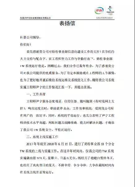 2019年初,科箭收到了來(lái)自伊利奶粉事業(yè)部物流管理部的一封感謝信。除了感謝科箭“一直以來(lái)對(duì)伊利奶粉事業(yè)部信息化建設(shè)工作的支持與幫助”,科箭人對(duì)工作的認(rèn)真負(fù)責(zé)和團(tuán)隊(duì)精神,也深深地感動(dòng)了伊利。